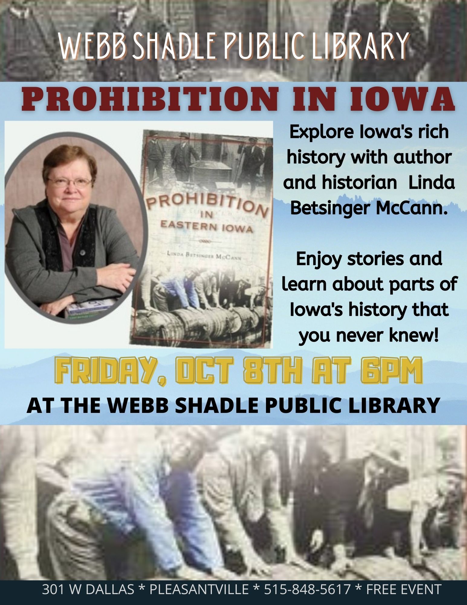 Prohibition banned the sale of alcohol in the United States from 1920-1933 and Iowans weren’t immune to the craziness it caused. Eastern Iowans made their own illegal liquor and trafficked it like the rest of the nation. Join us for a presentation by author Linda Betsinger McCann as we learn all about how this unique time period impacted the state.