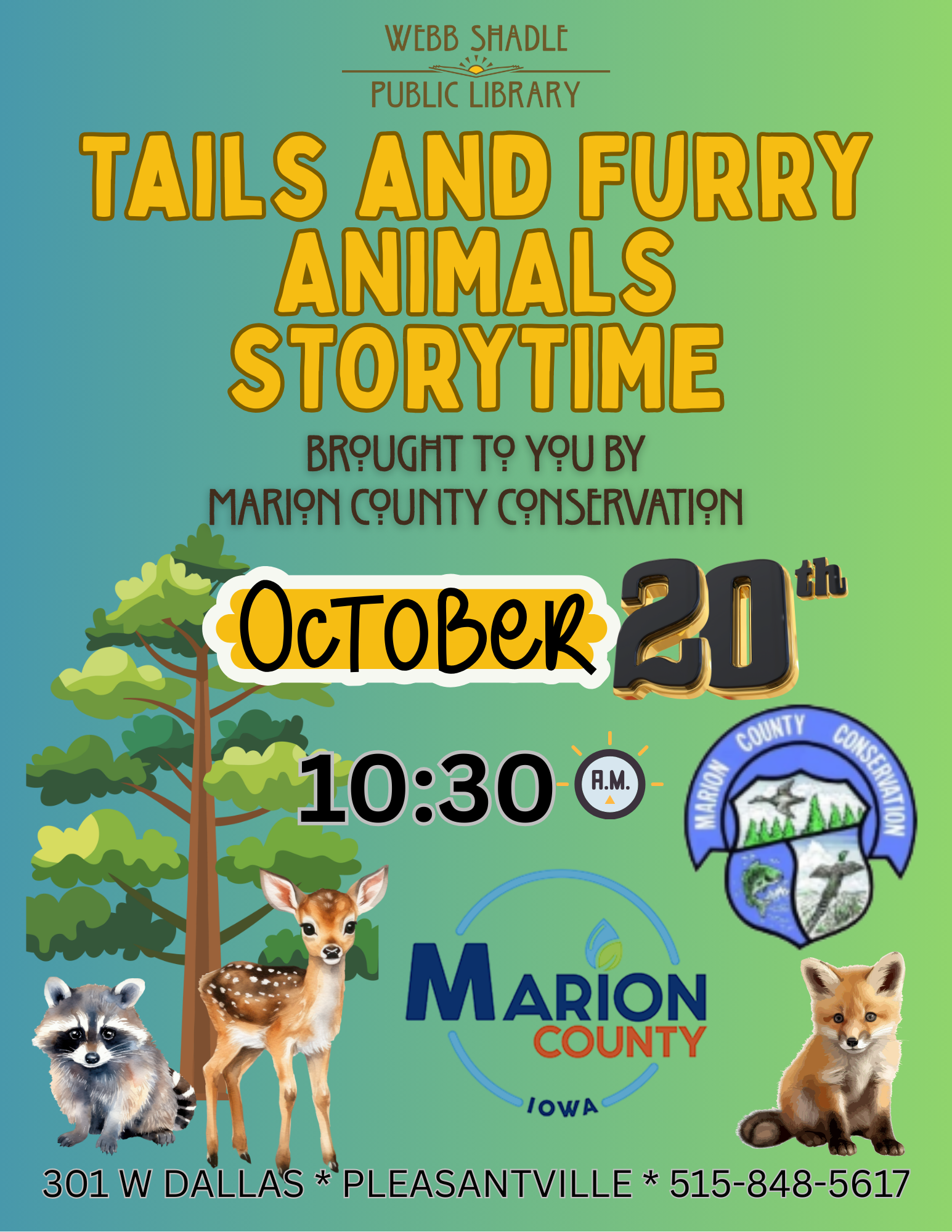 ![]() Join us for a fun storytime adventure hosted by our wonderful friends at the Marion County Conservation! Enjoy a story, participate in a matching game, and learn about different mammals found in our great state of Iowa. Naturalist Karen Johlas-Szalkowski will be bringing some real furs for everyone to touch and experience up close. We [...] |