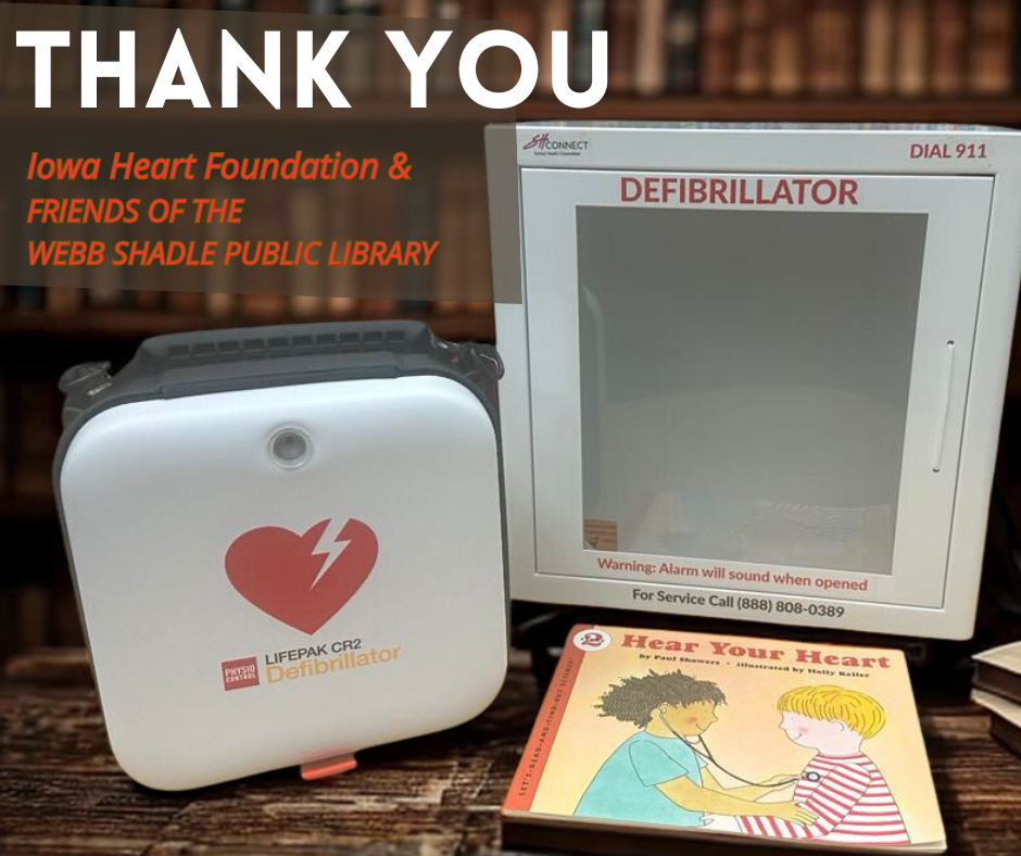 We would like to extend a heartfelt thank you to the Friends of the Webb Shadle Public Library for their generous donation of an automated external defibrillator (AED) to our library. We also want to express our gratitude to everyone at the Iowa Heart Foundation for their contribution of an AED cabinet.